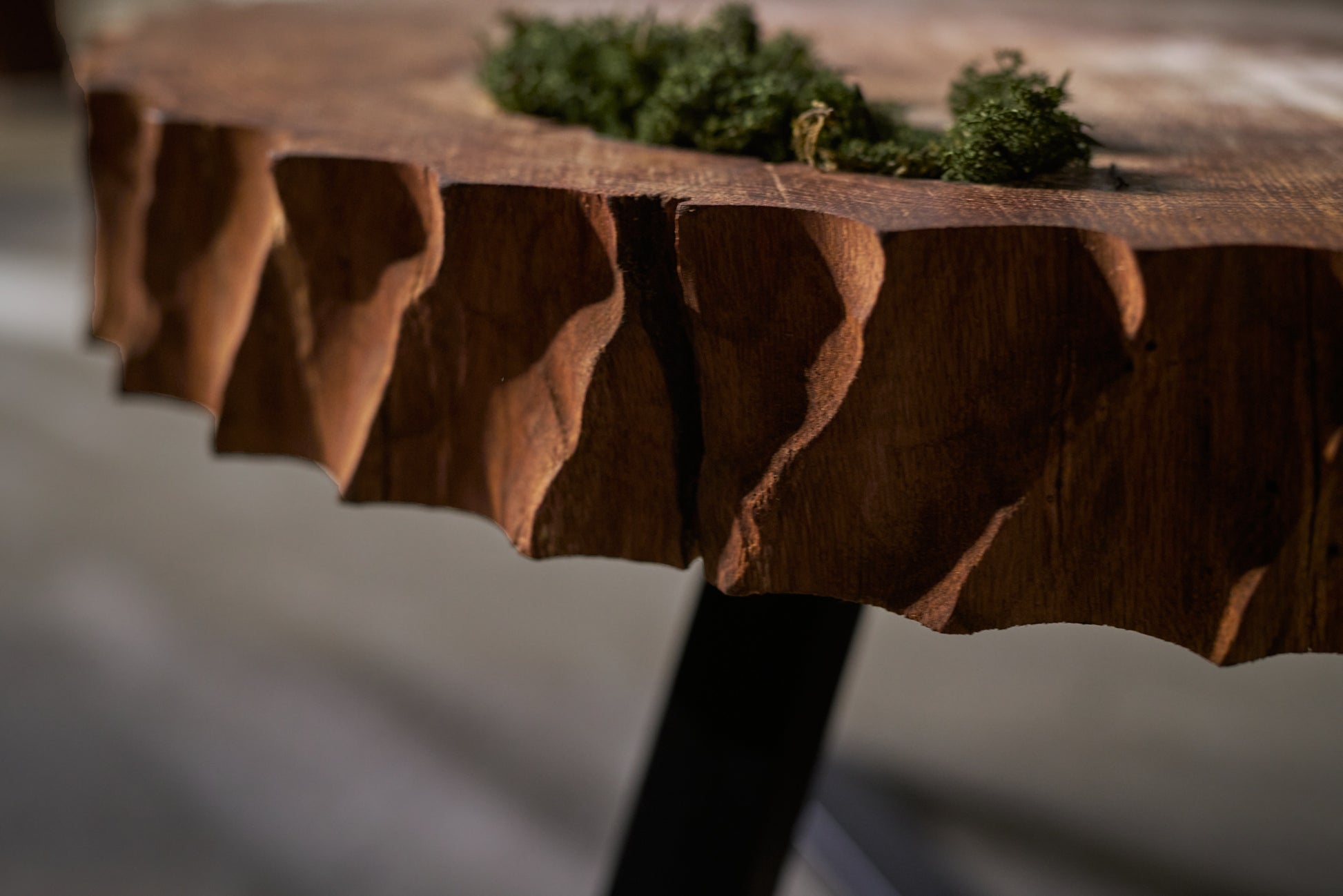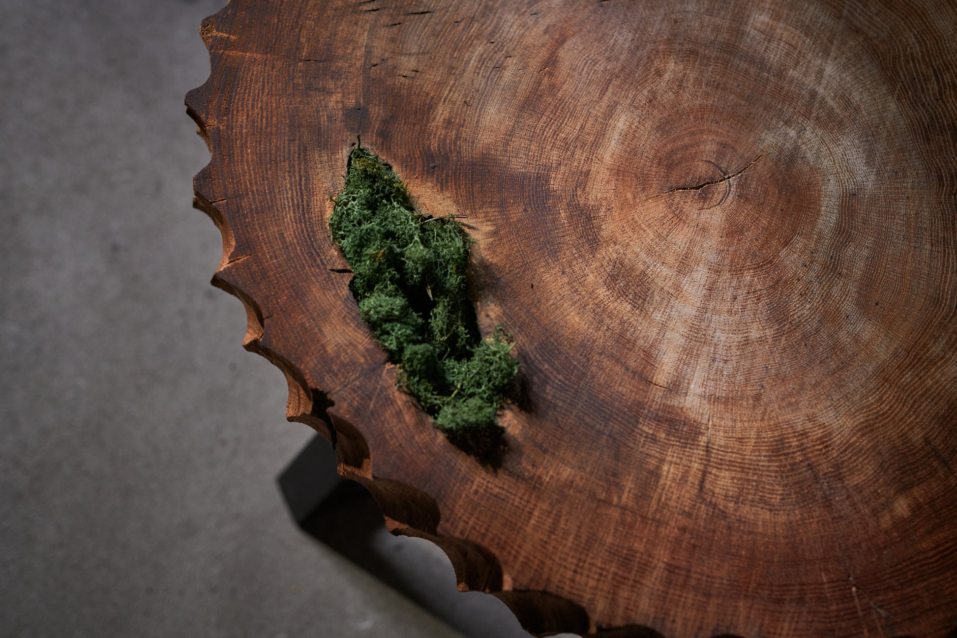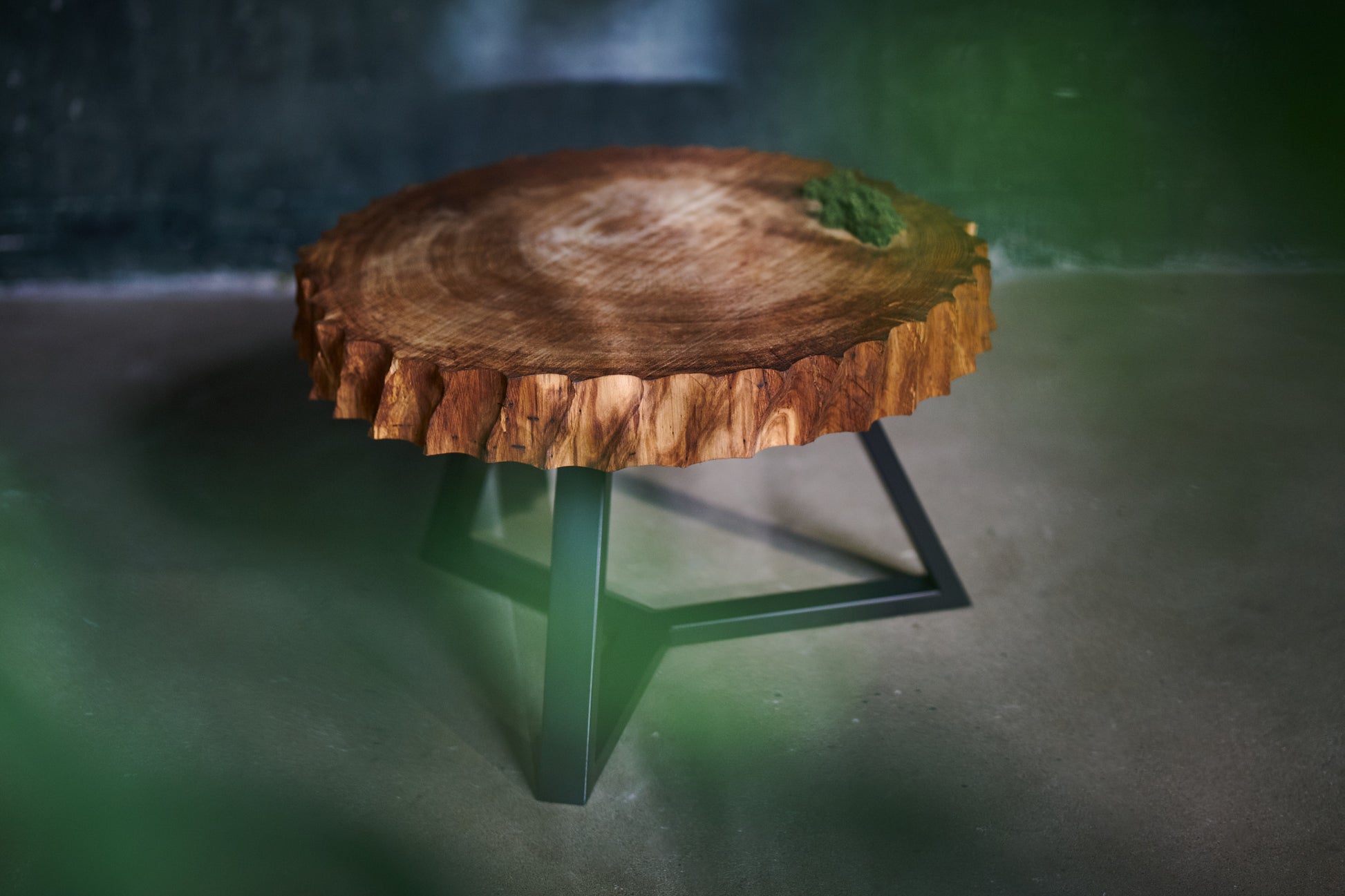 Kavos stalas pagamintas iš natūraliai žuvusio ąžuolo masyvo. Kiekvienas gaminys unikalus – su natūraliomis metų žiedų struktūromis ir originalia briauna. Paviršiuje įkomponuotas stabilizuoto samanų intarpas. Kojos – dažyto metalo, tvirtos ir stabilios konstrukcijos.