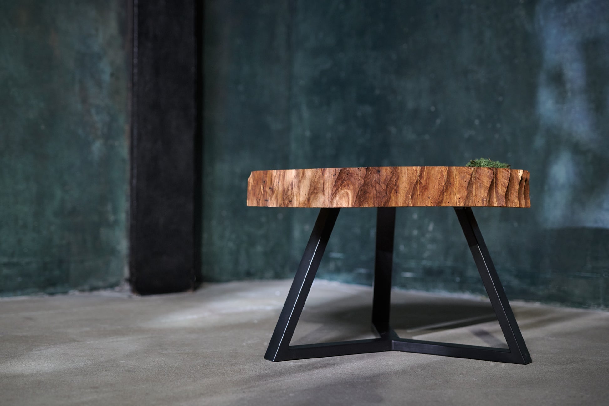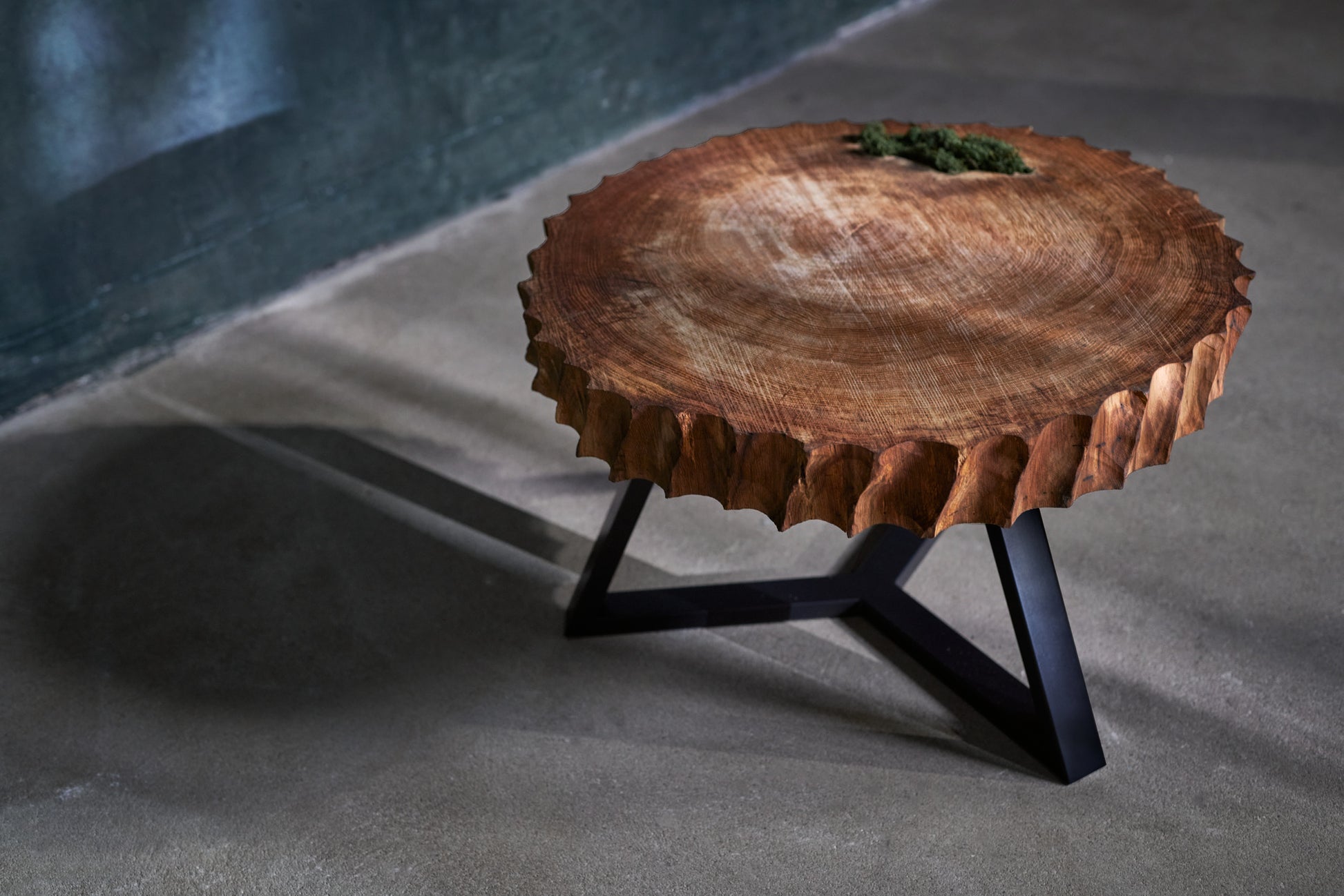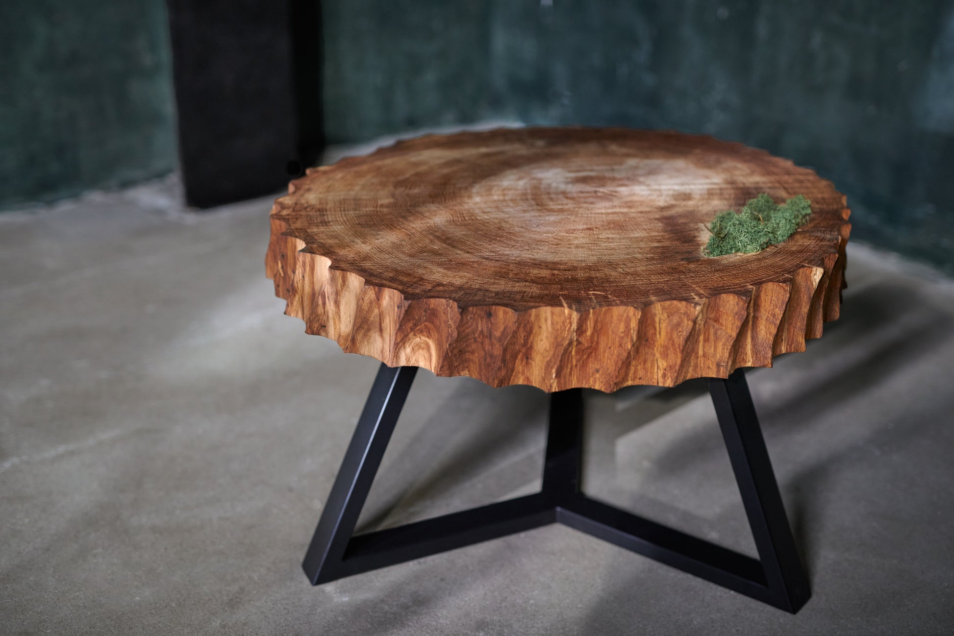Kavos stalas pagamintas iš natūraliai žuvusio ąžuolo masyvo. Kiekvienas gaminys unikalus – su natūraliomis metų žiedų struktūromis ir originalia briauna. Paviršiuje įkomponuotas stabilizuoto samanų intarpas. Kojos – dažyto metalo, tvirtos ir stabilios konstrukcijos.