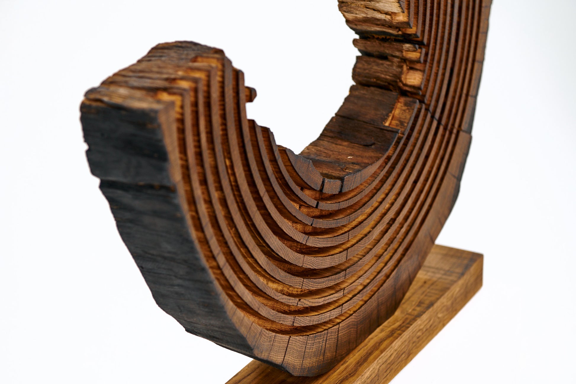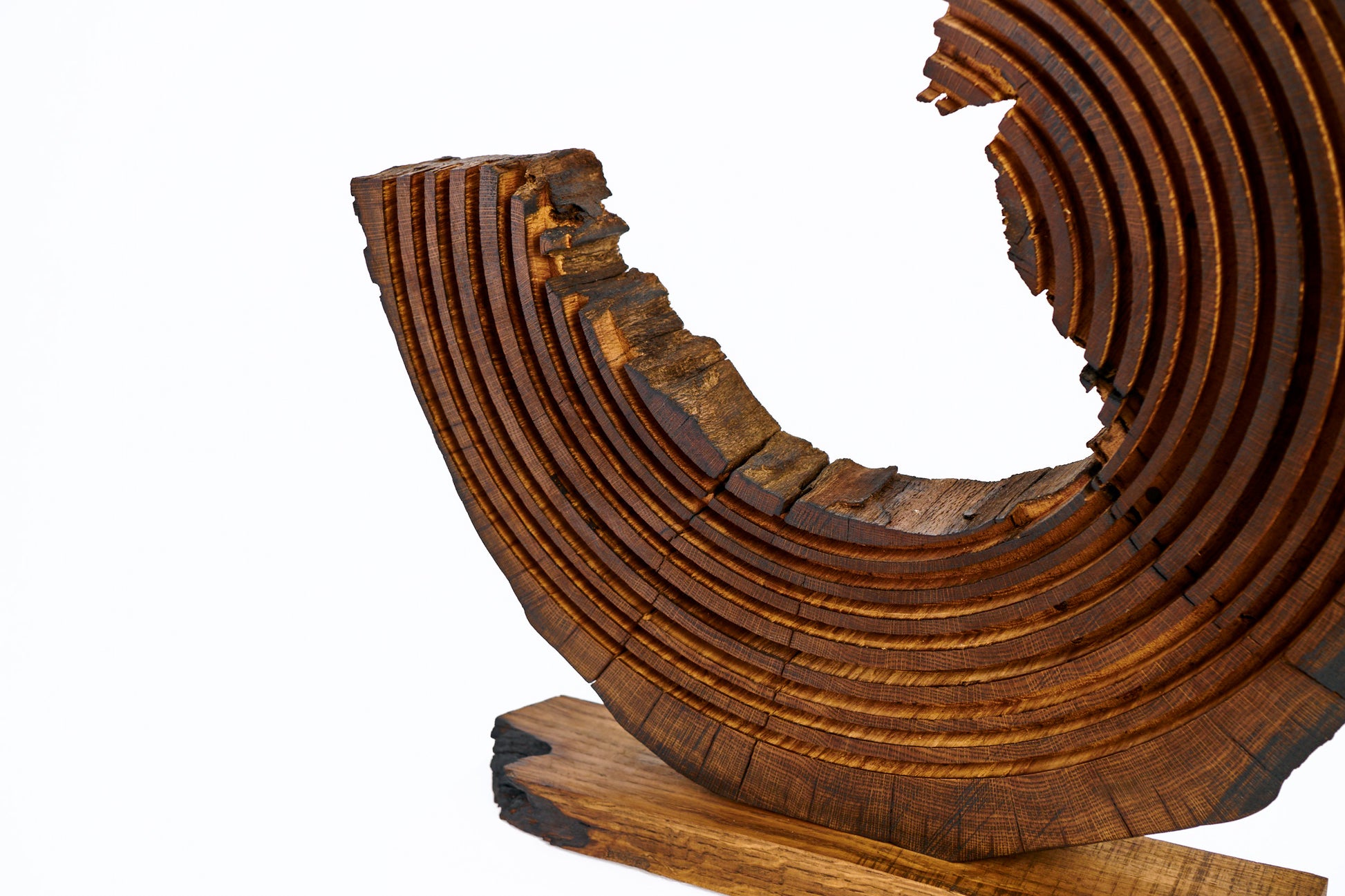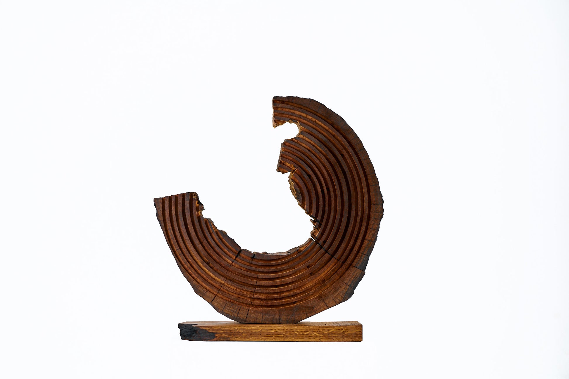 Medinė skulptūra sukurta iš senos ąžuolo kamieno dalies, kurios forma atskleidžia natūralius laiko padarinius. Mediena išdrožinėta koncentriškomis linijomis, primenančiomis augimo žiedus ar bangas. Išėstos dalys – tarsi nutrintas istorijos fragmentas. Skulptūra stovi ant ąžuolinės bazės, jos paviršius apdegintas ir švelniai nugludintas, išryškinant tekstūrą. Tai dekoratyvus objektas, kuris jungia natūralų senumą ir žmogaus rankos preciziką.