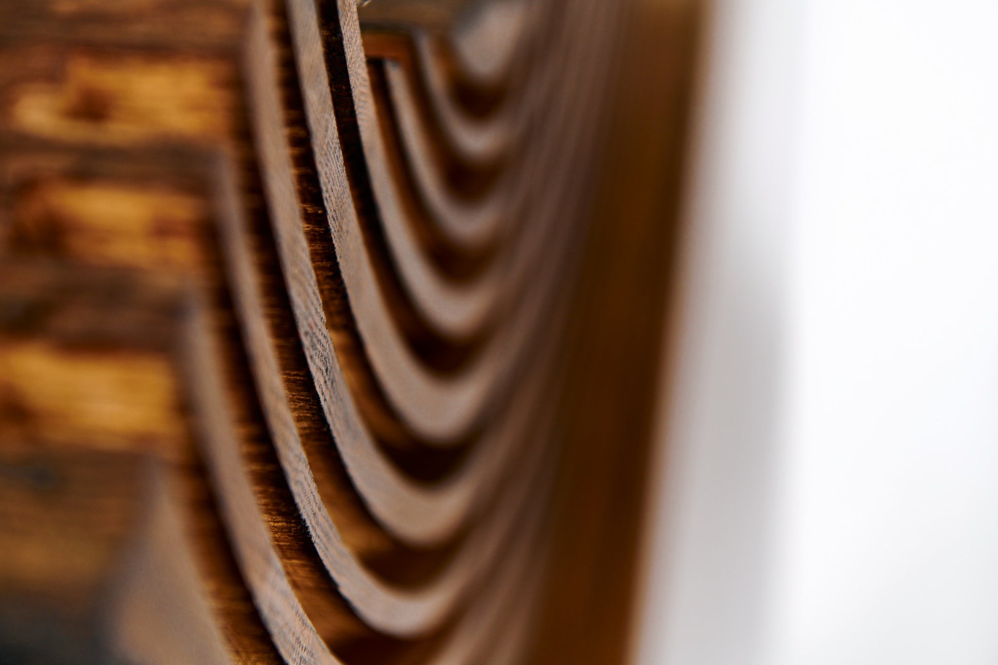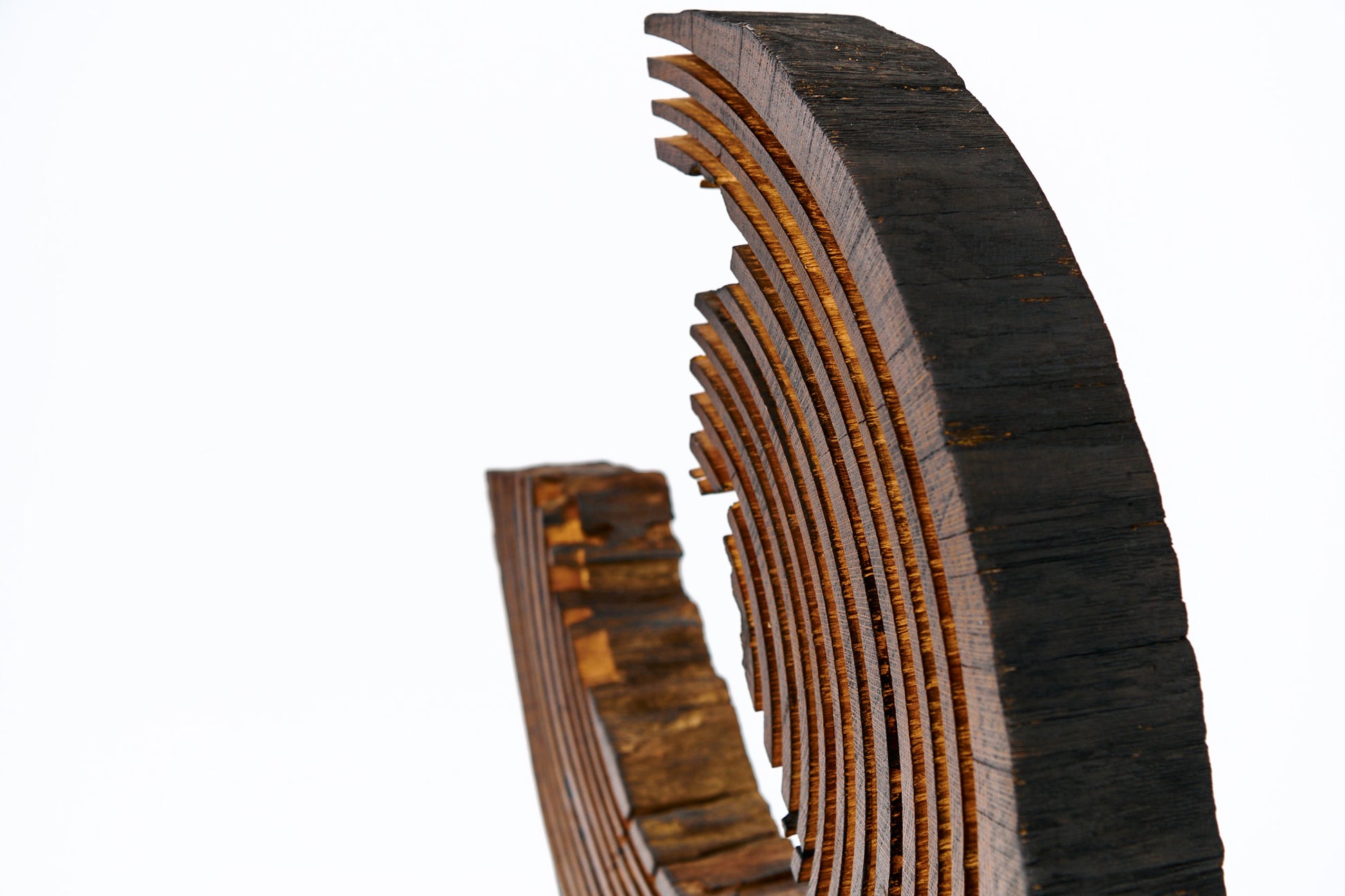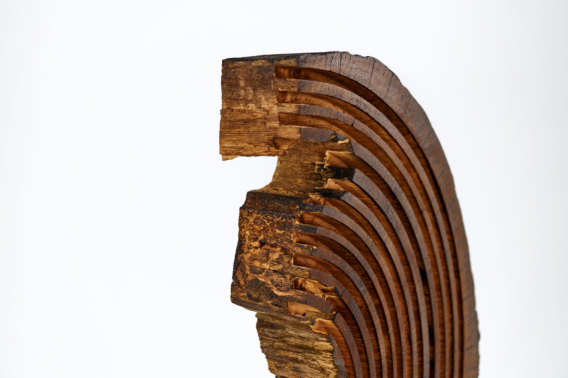 Medinė skulptūra sukurta iš senos ąžuolo kamieno dalies, kurios forma atskleidžia natūralius laiko padarinius. Mediena išdrožinėta koncentriškomis linijomis, primenančiomis augimo žiedus ar bangas. Išėstos dalys – tarsi nutrintas istorijos fragmentas. Skulptūra stovi ant ąžuolinės bazės, jos paviršius apdegintas ir švelniai nugludintas, išryškinant tekstūrą. Tai dekoratyvus objektas, kuris jungia natūralų senumą ir žmogaus rankos preciziką.