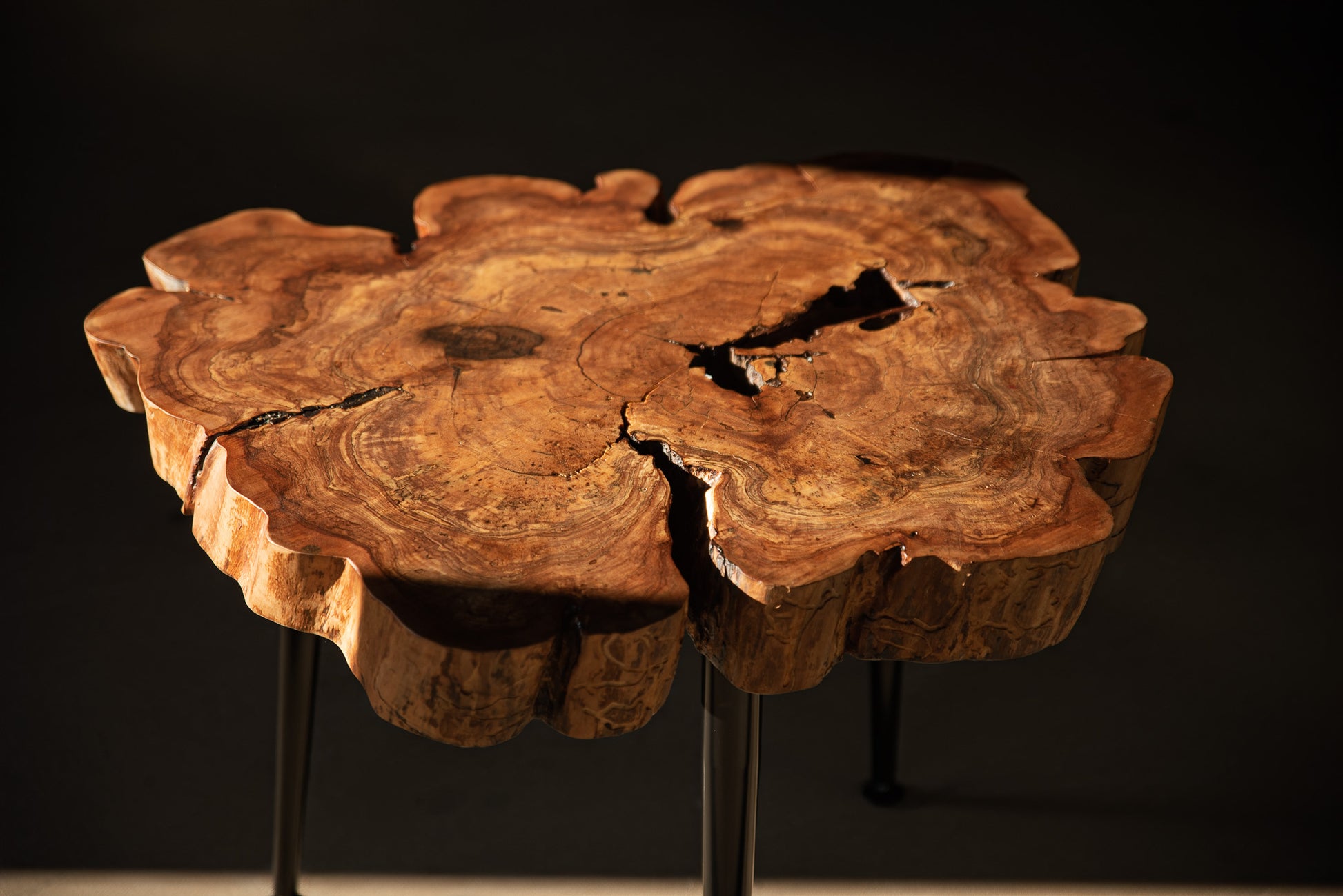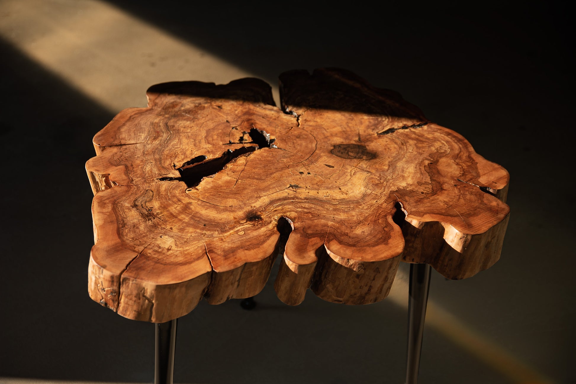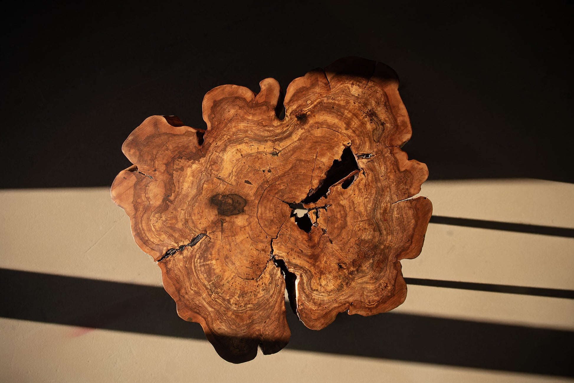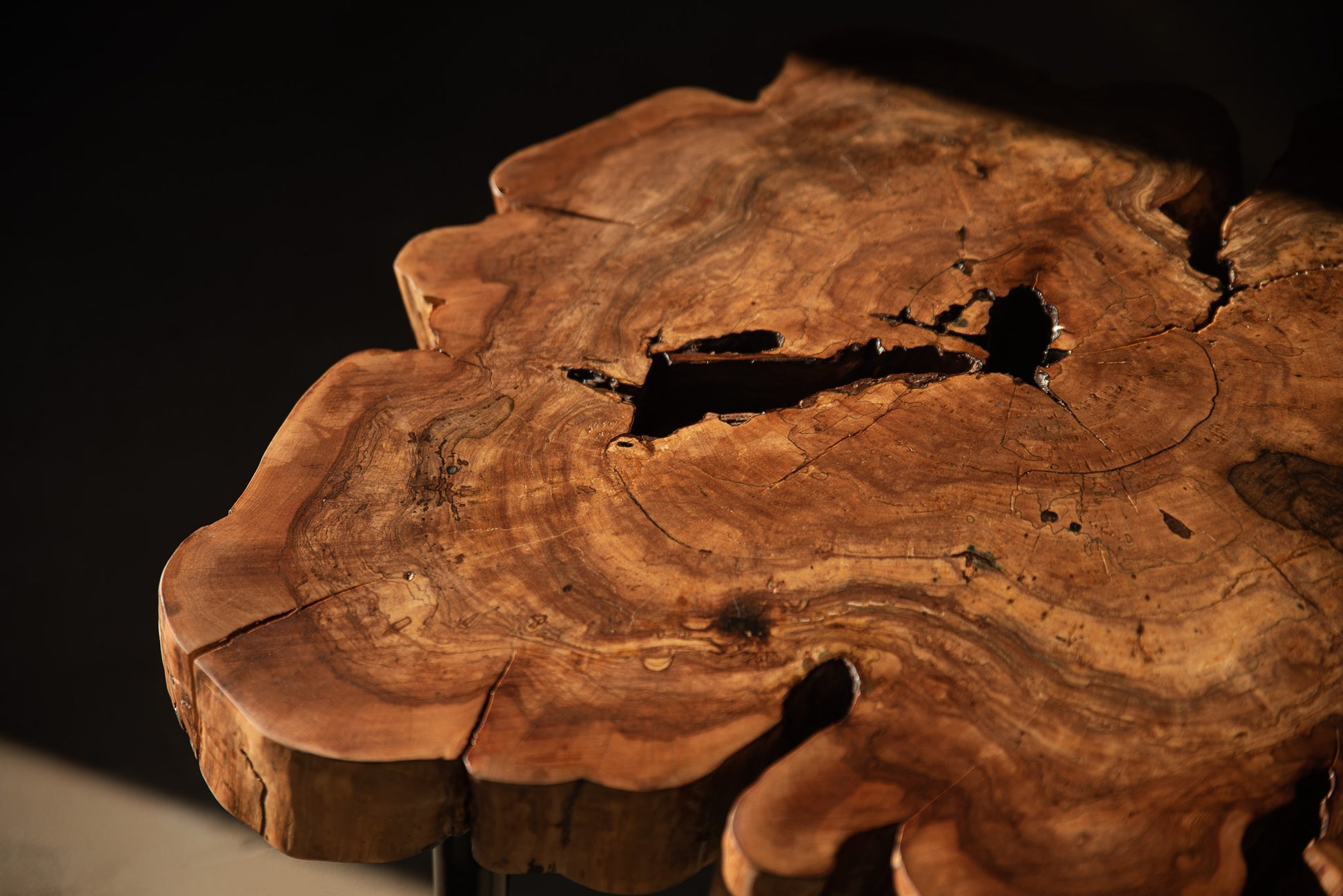 Kiekvienas obels rievėse užfiksuotas laiko ženklas tampa unikaliu raštu, o natūralūs įtrūkimai ir ertmės subtiliai užpildyti epoksidu išryškina medžio charakterį.