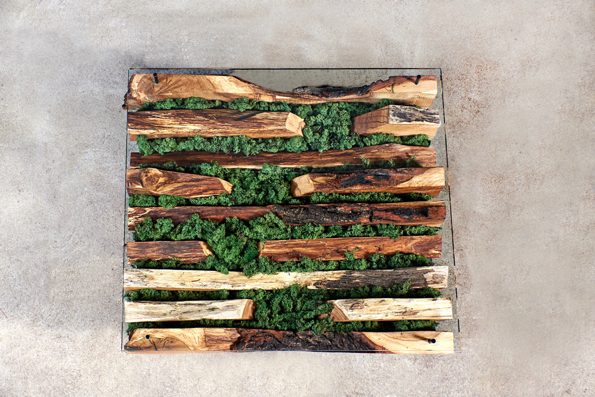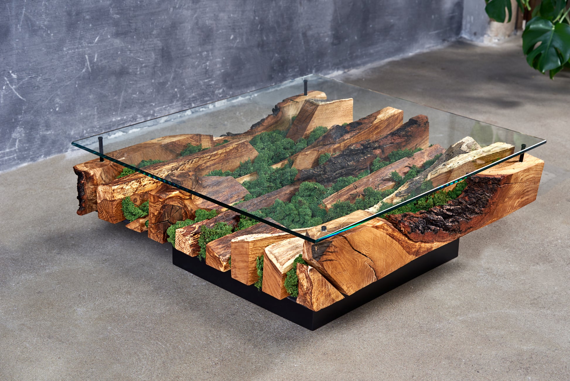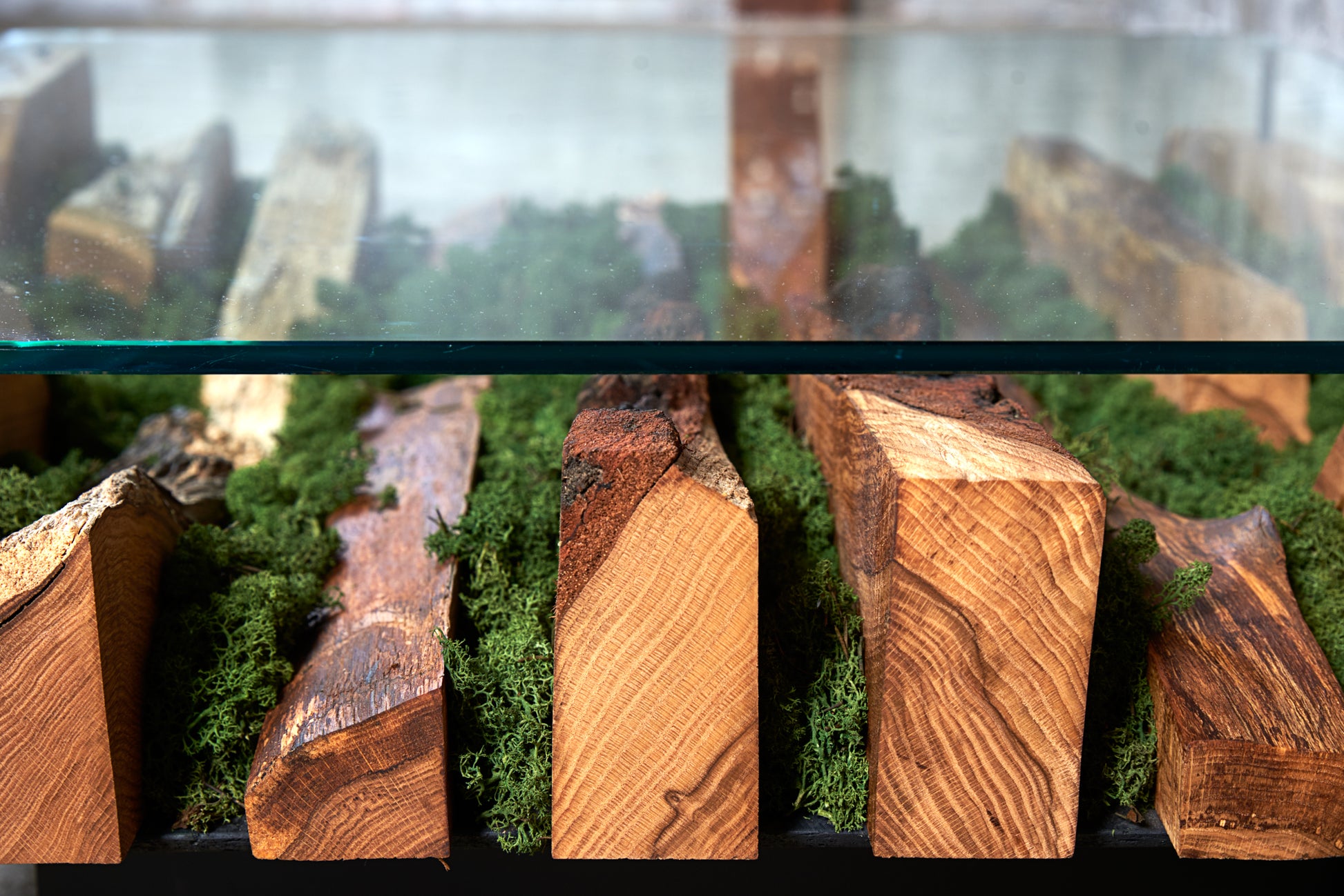 Unikalus kavos staliukas, sukurtas iš ąžuolo, stabilizuotų samanų ir stiklo. Ąžuolo fragmentai išdėstyti tarsi abstrakti kalnų ar kanjono kompozicija – kiekviena medžio dalis skirtinga savo tekstūra, žieve ar pjūviu. Tarp medienos intarpų – samanų plotai, kuriuose slypi gyvybės ramybė. Grūdintas stiklas suteikia funkcionalumo, o vizualiai išryškina visą skulptūrišką kompoziciją. Stalas remiasi ant masyvios metalinės bazės. Tai daugiau nei baldas – tai gamtos istoriją pasakojantis objektas.