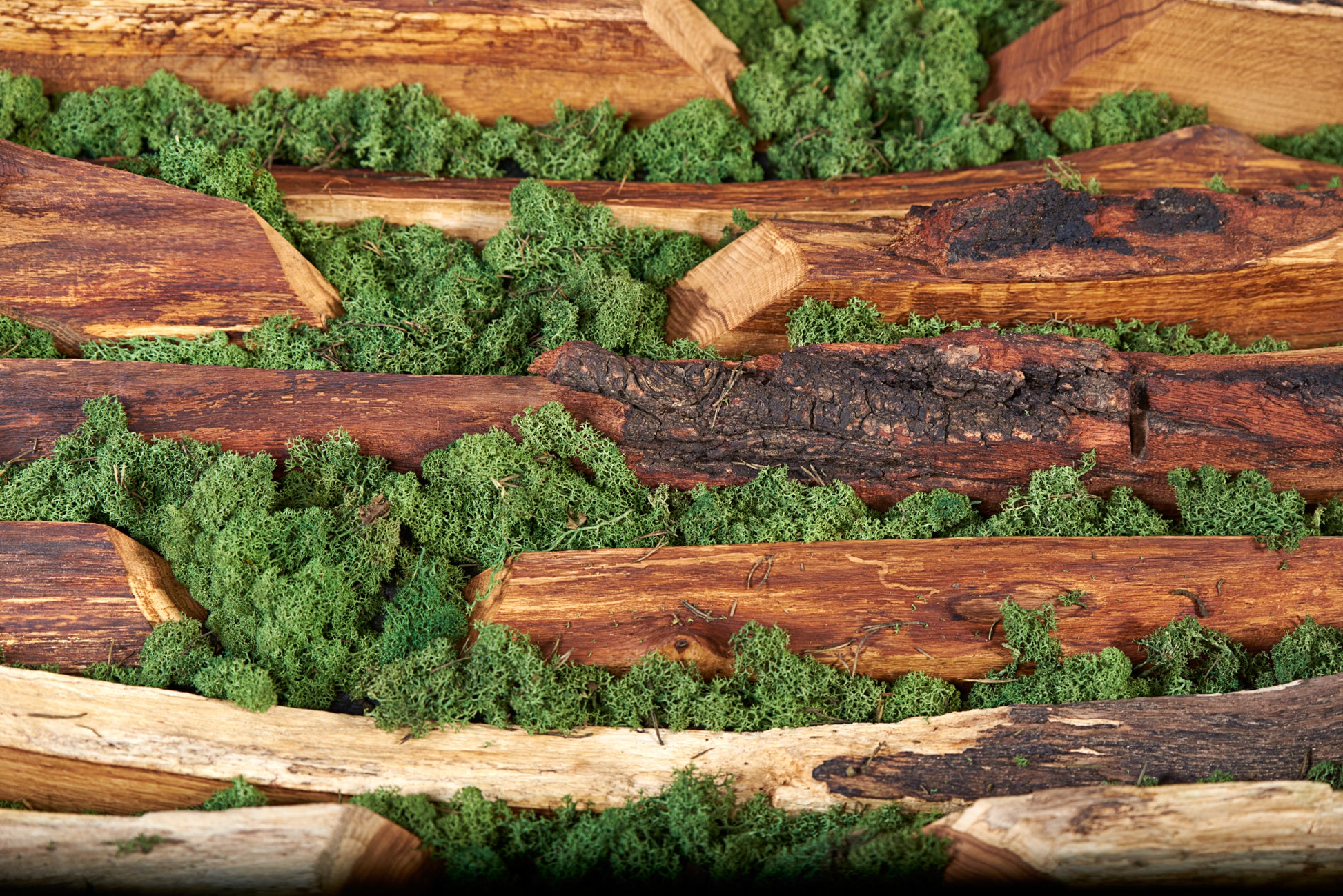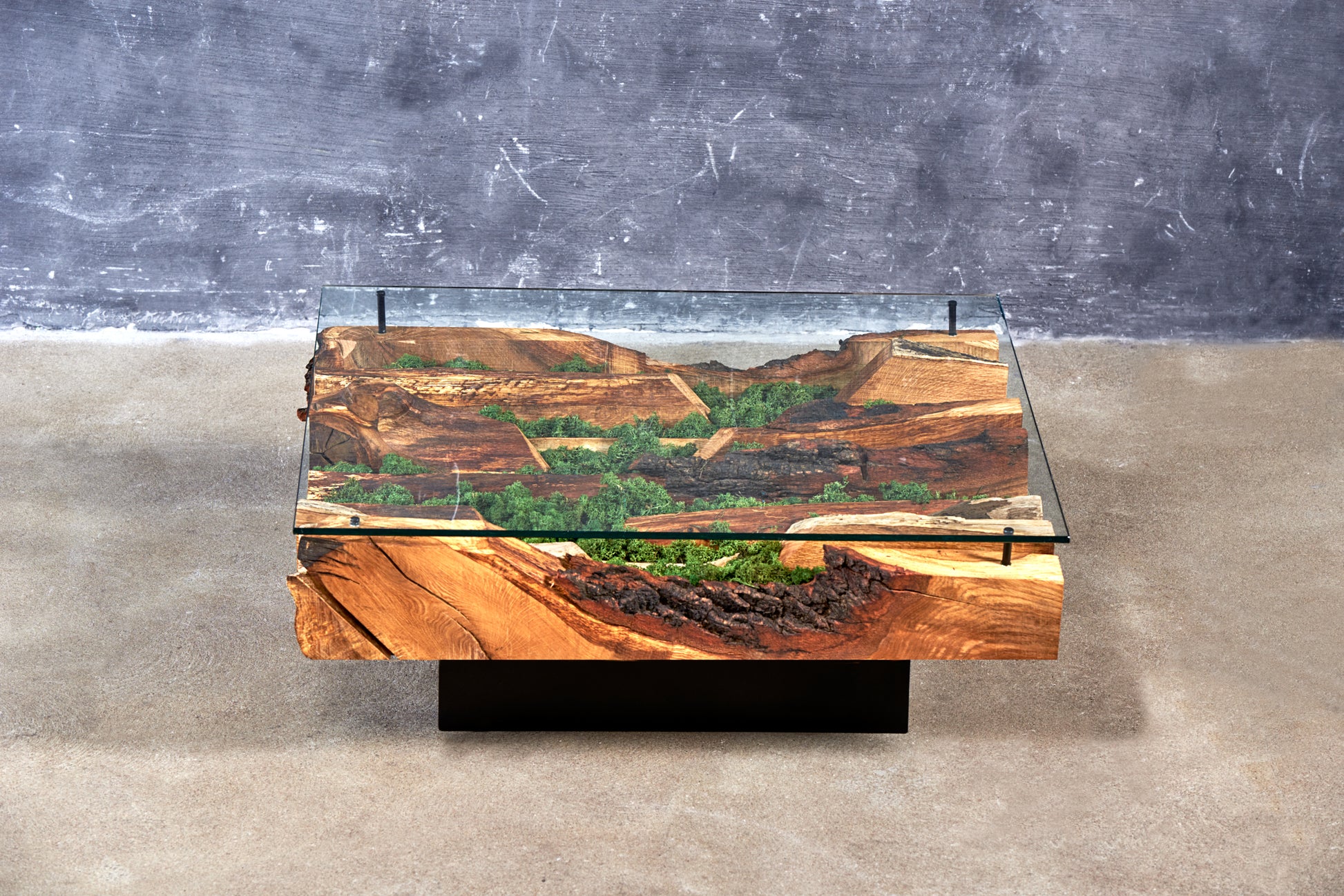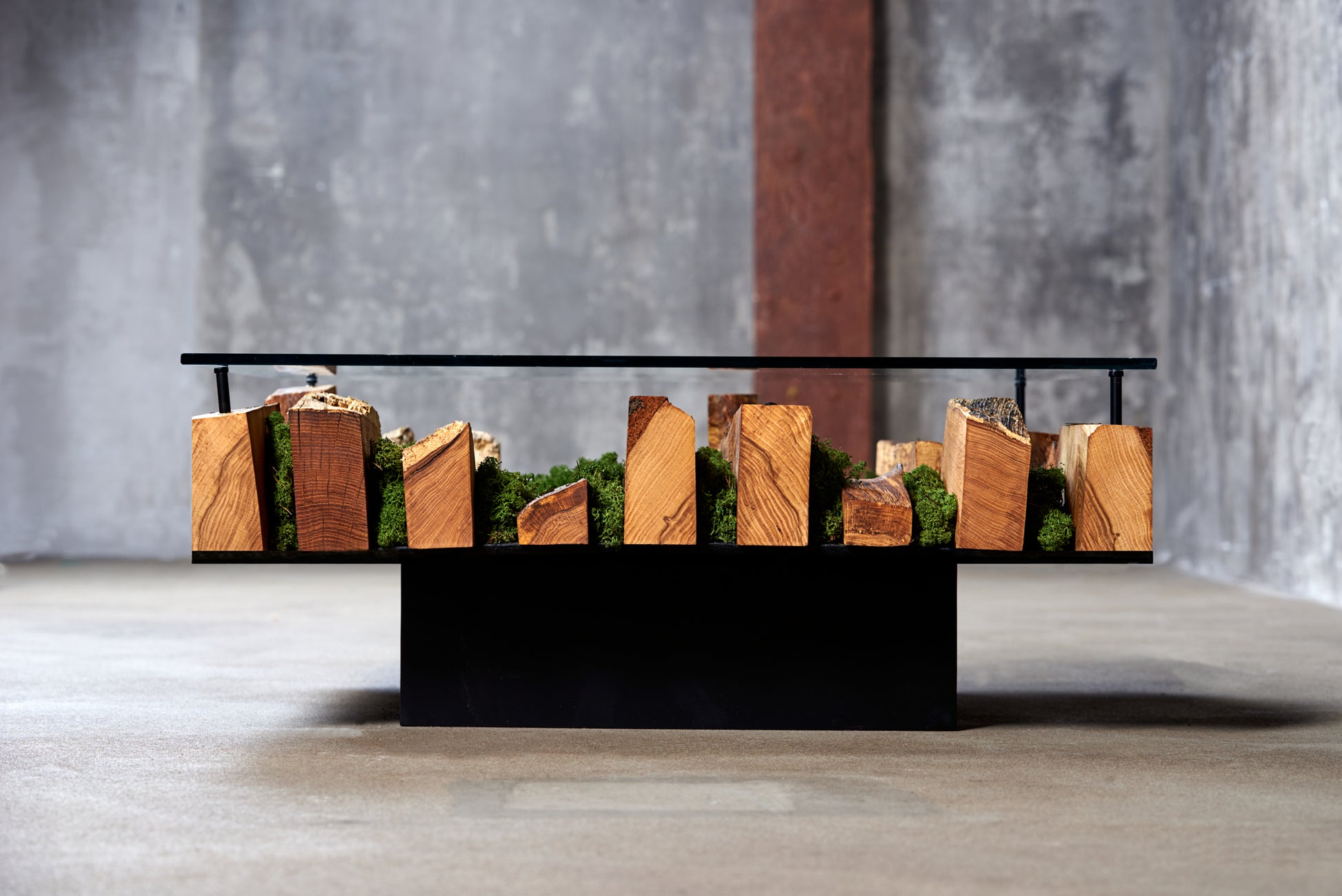 Unikalus kavos staliukas, sukurtas iš ąžuolo, stabilizuotų samanų ir stiklo. Ąžuolo fragmentai išdėstyti tarsi abstrakti kalnų ar kanjono kompozicija – kiekviena medžio dalis skirtinga savo tekstūra, žieve ar pjūviu. Tarp medienos intarpų – samanų plotai, kuriuose slypi gyvybės ramybė. Grūdintas stiklas suteikia funkcionalumo, o vizualiai išryškina visą skulptūrišką kompoziciją. Stalas remiasi ant masyvios metalinės bazės. Tai daugiau nei baldas – tai gamtos istoriją pasakojantis objektas.